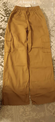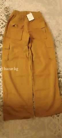 Широкие брюки-карго цвета camel - Свободный прямой крой, широкая штанина - Эластичный пояс на резинке - Функциональные накладные карманы: два спереди под клапанами и по одному на каждой штанине сбоку - Плотная гладкая ткань, держит форму - Универсальный оттенок тёплого карамельного (camel) - Подходят для повседневных образов, поездок и активного отдыха Бирка на поясе, классическая посадка на талии.