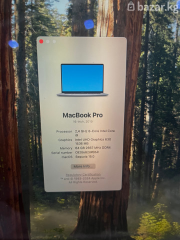 MacBook Pro 16" (2019), цвет Space Gray Характеристики по системе: - Процессор: Intel Core i9, 8‑ядерный, 2,4 ГГц - Графика: Intel UHD Graphics 630, 1536 МБ - Оперативная память: 64 ГБ DDR4 2667 МГц - macOS: Sequoia 15.0 - Диагональ дисплея: 16 дюймов, Retina - Номер модели/серийный номер видны на скриншоте Особенности: - Клавиатура с Touch Bar и Touch ID - Большой стеклянный трекпад Force Touch - Встроенные стереодинамики по бокам клавиатуры - Корпус из алюминия, цвет Space Gray - Порты USB‑C/Thunderbolt 3 (видны на фото боковой грани) В комплекте: - Оригинальное зарядное устройство USB‑C с кабелем (на фото в пакете) Ноутбук включён на фото: показаны спецификации системы и рабочий стол. Подходит для задач, требующих высокой производительности и большого объёма ОЗУ: разработка, обработка фото/видео, работа с 3D и многозадачность.