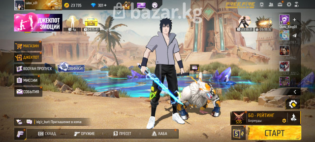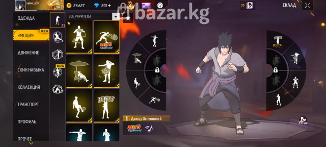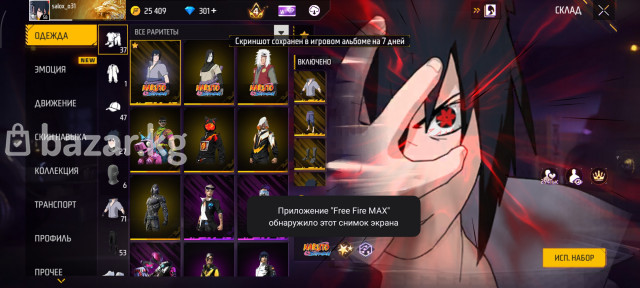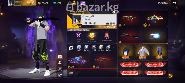 💎 Задоначено очень большое количество алмазов + активный недельный ваучер ⚔️ 2 катаны, одна из них эксклюзивная из коллаборации Naruto 🔥 4 эволюции оружия: UMP — 2 уровень AK-47 — 4 уровень SCAR — 2 уровень Гроза — 3 уровень 👕 70+ торсов (верхняя одежда) — отобранные, без мусора 🧱 Эксклюзивная стенка PRIME ⭐ PRIME 4 (активирован) 🌀 Анимация добивания из коллаборации Naruto 👊 Кулак Ниндзюцу 🥷 Набор Саске 🚀 2 дорогих скайджета 😎 21 эмоция 🔐 Аккаунт чистый — без резервной почты, только основная привязка ✅ Подходит для комфортной игры, коллекции и перепродажи 💰 Аккаунт для тех, кто хочет донат и эксклюзивы без долгого фарма