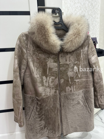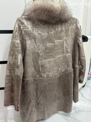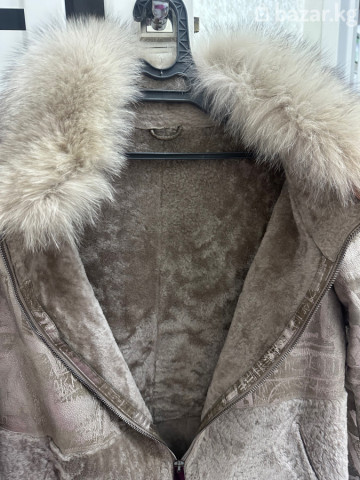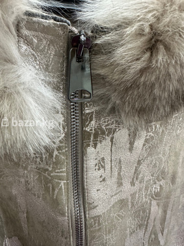 Женская дублёнка с натуральным мехом - Цвет: нежный тауп/бежево‑серый. - Верх: мягкая замша с тиснённым абстрактным принтом. - Низ полочек и внутренняя часть: густой ворс/овчина в тон. - Застёжка: надёжная металлическая молния по всей длине. - Воротник: объёмный съёмный (визуально — натуральный пушистый мех, теплый и плотный). - Подклад: меховая, утеплённая по всему изделию. - Крой: прямой, комфортная длина до середины бедра. - Рукава: длинные. - Карманы: 2 боковых кармана. - Детали: крупный бегунок на молнии для удобства, аккуратные строчки, мягкая посадка. Идеальный вариант для холодной погоды: сочетает тепло натурального меха и стильную фактуру замши с принтом. Универсальный спокойный оттенок легко комбинируется с повседневным гардеробом.