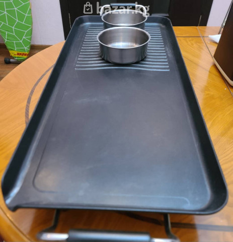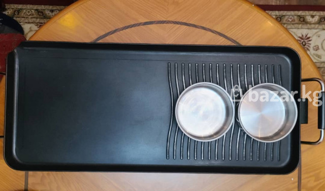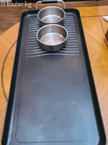 Большая прямоугольная жарочная поверхность-гриль с ребристой зоной и двумя металлическими мисками. Особенности: - Две рабочие зоны: гладкая поверхность для жарки и ребристая часть для гриля с отводом жира. - В комплекте 2 круглые стальные емкости/миски (для соусов, маринадов или гарниров). - Высокие бортики по периметру — ничего не стекает на стол. - Удобные боковые ручки с термонакладками для переноса. - Подходит для приготовления мяса, рыбы, овощей, шаурмы, бургеров, сырников и т. п. - Форм‑фактор настольной электрической планчи/гриля или поддон для мангала/плиты. Удобен для домашней кухни, дачи и небольших мероприятий: можно готовить и подавать прямо на столе.