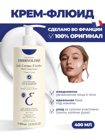 Embryolisse Питательный крем-флюид Lait-Crème Fluide+ 400 ml — это универсальный уход для всей семьи, который обеспечивает интенсивное увлажнение для тела и бережный уход за кожей. Этот увлажняющий крем для тела подходит для ежедневного применения и прекрасно работает как крем для рук и тела с дозатором. После душа кожа особенно нуждается в уходе — именно поэтому крем для тела после душа Embryolisse идеально восстанавливает баланс, делая кожу мягкой и гладкой. Удобный крем для тела с дозатором обеспечивает экономичное и гигиеничное использование. Формула крема действует как крем для тела увлажняющий питательный и как крем для рук с дозатором увлажняющий. Он помогает бороться с сухостью и может использоваться как крем для рук с дозатором от сухости и как крем для сухой кожи тела. Средство универсально: оно может применяться как крем для рук и тела, крем питательный для тела и как увлажняющий крем для повседневного ухода. Также его удобно использовать как крем для рук с дозатором, особенно если нужна защита и уход в течение дня. Embryolisse Lait-Crème Fluide+ подходит для чувствительной кожи и действует как крем для сухой кожи тела, крем-лосьон для рук и крем для тела успокаивающий. Его можно использовать как крем для рук увлажняющий и питательный, а также как крем для увлажнения тела. Продукт эффективен и в уходе за руками — работает как крем для сухой кожи рук, питательный крем для рук и тела и как увлажняющий крем для рук от сухости. Благодаря большому объёму флакона это крем для тела большой, который идеально подойдёт для всей семьи. Его можно использовать как крем от раздражения, питающий крем, крем для тела большой объём или как универсальный крем для тела большой.Увлажняющее молочко-крем Embryolisse Lait-Creme Fluide имеет мягкий натуральный состав и подходит для всей семьи. Крем для лица может использоваться как увлажняющий крем для ежедневного ухода за лицом, как питательная и увлажняющая маска (несколько раз в неделю), как лосьон после бритья (по мере необходимости) и даже как детский крем против сухости, раздражения, воспалений и повреждений кожи Независимо от способа применения молочко легко и быстро впитывается и оказывает на кожу увлажняющий, питательный, смягчающий и защитный эффект, а также снимает ощущение стянутости, сухости, зуд и жжение. А также крем для тела,крем для лица увлажняющий,увлажняющий крем для лица. Масло ши необходимо для питания и смягчения кожи и подходит для любого ее типа, хотя особенно рекомендуется для сухой, чувствительной и поврежденной. Оно не только мгновенно снимает сухость и стянутость, но и уменьшает зуд и жжение, которые для них характерны, а также способствует быстрому исчезновению раздражения и восстановлению кожи после мелких повреждений. Гидролизованные протеины сои необходимы для глубокого увлажнения кожи, а также помогают надолго сохранить влагу в самых глубоких ее слоях, тонизируя ее, разглаживая морщины и возвращая ей эластичность и упругость. Алоэ вера увлажняет и тонизирует кожу, наполняя ее свежестью и возвращая ей упругость, а также эффективно защищает ее от негативного внешнего воздействия. К тому же, он имеет антибактериальные и противовоспалительные свойства, благодаря которым способствует заживлению кожи и эффективно борется с воспалениями. Lait-Creme Fluide от французского бренда Embryolisse Laboratories — многофункцион