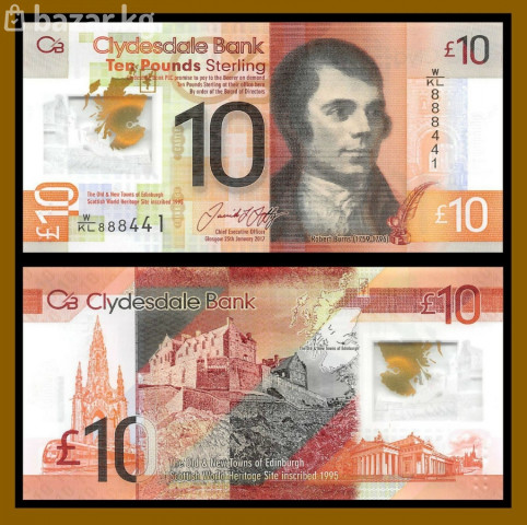 Шотландская банкнота Clydesdale Bank £10 (Ten Pounds Sterling), выпуск 25 января 2017. В наличии: ✅ - Номинал: 10 фунтов стерлингов. - Эмитент: Clydesdale Bank PLC (Шотландия). - Материал: полимер. - Основные элементы дизайна: - Портрет Роберта Бёрнса (1759–1796). - Перо и подпись руководителя банка. - Крупная цифра «10», надписи Ten Pounds Sterling. - Водяное окно/прозрачное окно с картой Шотландии и защитными элементами. - Изображения Эдинбурга: Эдинбургский замок, исторические Старый и Новый город (The Old & New Towns of Edinburgh, объект Всемирного наследия ЮНЕСКО с 1995 года). - Номинал «£10» в углах лицевой и оборотной сторон. - Язык надписей: английский. - Защитные признаки, видимые на фото: прозрачное окно, микротекст/тонкие линии, серийный номер, цветопереливные элементы. - Размеры: стандарт полимерной десятки Clydesdale Bank (приблизительно формат современной шотландской £10). Сохранность: EF - «экстра файн», «eXtremely Fine» ( отличной сохранности): ❗ На фото представлен пример. Серия и номер могут отличаться. ❗ Купюра подлинная 💰 Оплата принимается: С $ € £ 📌 Купить банкноту можно за евро-монеты. Подходит для коллекционеров банкнот, ценителей шотландской истории и дизайна полимерных выпусков. ❕ Объявление будет удалено или деактивировано после продажи.