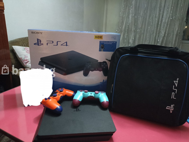 Игровая консоль Sony PlayStation 4 (PS4 Slim, черная) с комплектом аксессуаров и игрой. В комплекте: - Консоль PS4 Slim 500gb. - Два беспроводных геймпада DualShock 4(реплика): один оранжево-синий, второй бирюзово-бордовый. - Фирменная сумка-чехол PS4 с передним карманом на молнии и ручками для переноски. - Оригинальная коробка PS4 (HDR). Особенности: - Поддержка HDR для совместимых телевизоров. - Удобная переноска и хранение благодаря сумке. - Два контроллера — удобно для локального мультиплеера. Состояние идеальное, геймпады не залипают, консоль просто пушка, все игры летают