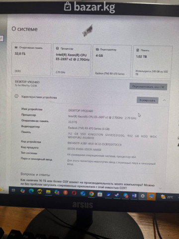 🖥 Игровой ПК | Xeon E5 + RX 470 | 32 ГБ ОЗУ Продаю готовый системный блок, собранный и полностью рабочий. Подходит для игр, работы и учёбы. ПК чистый, с RGB-подсветкой и стеклянной боковой панелью. 🔹 Характеристики: Процессор: Intel Xeon E5-2697 v2 (12 ядер / 24 потока, 2.7 ГГц) ОЗУ: 32 ГБ DDR3 Видеокарта: AMD Radeon RX 470 4 ГБ (тянет GTA V, CS2, Dota 2, PUBG, Warzone и другие на средне-высоких настройках) SSD: 120 ГБ (Windows установлен, быстрый запуск) HDD: 1 ТБ для игр и фильмов Корпус: с RGB-подсветкой и стеклянной крышкой Блок питания: 500–600W 🔹 Состояние: Полностью рабочий Чистый, не шумит, не перегревается Готов к использованию — включил и играешь! 💰 Цена: 27 000 сом (возможен торг при осмотре). 📍 Находится в [Бишкеке]. 📲 Пишите или звоните — отвечу на все вопросы: 0505 533 770