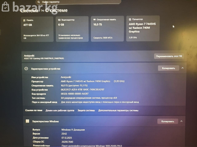 Игровой Ноутбук Asus Tuf Gaming A16: Процессор: AMD Ryzen 7 7000HS Видеокарта: NVIDIA GeForce RTX 4050 14 GB Дисплей: 16", IPS, WUXGA (1920x1200) Память: 16 ГБ DDR5 (5600–7500 МГц)два слота SO-DIMM. Накопитель: SSD PCIe 4.0 NVMe до 512 GB Аккумулятор: 90 Вт/ч (в ряде конфигураций — 56 Вт/ч). Вес: ~2.2 – 2.3 кг. Интерфейсы: USB4, USB 3.2 Gen2 Type-C, USB Type-A, HDMI 2.1, Wi-Fi 6E/7, Bluetooth 5.3. Ноутбук обеспечивает высокую производительность в играх и задачах требующих больших вычислительных мощностей при этом поддерживая возможность апгрейда оперативной памяти и SSD.