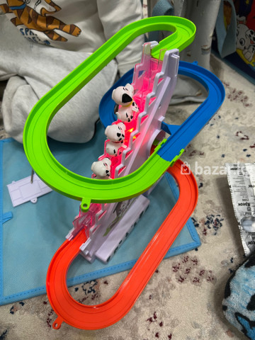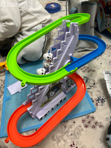 Игрушечная горка‑трек с поднимающимися фигурками щенков - Автоматический подъём: щенки по лестнице сами поднимаются наверх и скатываются по треку по кругу. - Многоуровневая конструкция: две петли разноцветных дорожек (зелёная и оранжевая/синяя), центральный «эскалатор». - Световые эффекты: в центральной части подсветка, создаёт яркое зрелище в темноте. - Комплектация на фото: база с механизмом, лестница‑эскалатор, сборные секции трека, несколько мини‑фигурок щенков. - Материал: прочный пластик, гладкие края. - Развивает: внимание, координацию, причинно‑следственные связи; завораживает непрерывным движением. - Удобно собирать и разбирать, компактно помещается на столе или на ковре. - Питание от батареек (отсек расположен в основании). Отличный интерактивный трек для детей: включаете — щенки карабкаются вверх и снова стремительно скатываются по дорожкам.