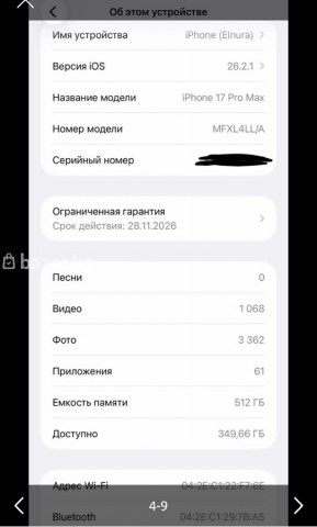 🇺🇸🇺🇸🇺🇸🇺🇸 IPhone 📱 17 Pro Max, 512 ГБ, цвет оранжевый (корпус и задняя панель в одном тоне). Три камеры с блоком вспышки, поддержка LTE. На фото — оригинальная коробка.Состояние 10/10 Идеал. В Комплекте оригинал зарядка коробка Характеристики по скриншотам: - Модель: iPhone 17 Pro Max (номер модели MFXL4LL/A).🇺🇸🇺🇸🇺🇸 - Память: 512 ГБ (доступно ~349,66 ГБ). - Версия iOS: 26.2.1. - Состояние аккумулятора: максимальная ёмкость 100%, 49 циклов перезарядки. - Дата изготовления аккумулятора: август 2025 г. - Первое использование: ноябрь 2025 г. - Ограниченная гарантия до 28.11.2026 - Поддержка LTE, Wi-Fi и Bluetooth (адреса интерфейсов показаны на фото). - Тройной модуль основной камеры с датчиком LiDAR/доп. сенсором, вспышка. Комплект: фирменная коробка, устройство в оранжевом цвете,оригинал кабель. Идеальное состояние.