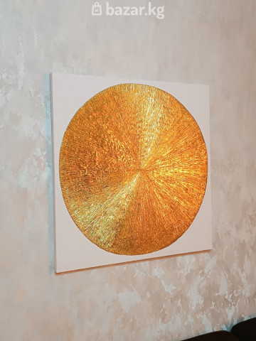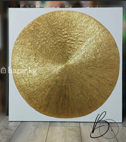 Текстурная картина «Круг изобилия» в современном стиле, размер 75×75 см. Ручная работа В наличии Отличный вариант для подарка. - Основа: деревянный холст на подрамнике - Техника: фактурная паста/рельеф, металлизированная золотая поталь/краска с выраженным блеском - Цвета: матовый белый фон и большой рельефный золотой круг с радиальными штрихами, создающими эффект сияния - Формат: крупный настенный размер (подходит для гостиной, кабинета, холла), 75×75см. - Особенности: объемная текстура, мерцает и меняет оттенки при разном освещении; минималистичный дизайн, легко вписывается в современный и классический интерьер - Ориентация: вертикальная или горизонтальная — по желанию - Готова к размещению на стене (подрамник аккуратно закрыт, края прокрашены) Идеальна как выразительный акцент, арт-объект над диваном, камином или в офисном пространстве. Подходит для сочетания с нейтральными стенами и тёплым освещением. На фото показано, как картина выглядит при дневном и теплом искусственном свете. На полотне авторская подпись.