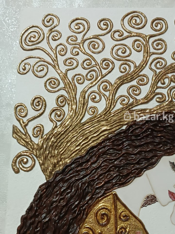 Объемная картина «Мать и дочь» в декоративной стилистике. Ручная работа В наличии Отличный вариант для подарка. - Основа: деревянный холст на подрамнике. 75×50 см. - Техника: авторская пастозная рельефная живопись/барельеф акриловыми материалами с золотистыми и бронзовыми пигментами; фактура завитков и элементов одежды выступает над поверхностью. - Сюжет: нежные объятия матери и ребенка на фоне декоративного «Древа жизни». - Цветовая палитра: белый, золотой, бронзовый, шоколадно-коричневые оттенки; перламутровые отблески. - Формат: вертикальный; размер 75×50 см. - Детали: прорисованные волосы с выраженной текстурой, орнаментальные спирали и точки, аккуратная подпись автора в правом нижнем углу. - Покрытие: защитный лак придает легкий блеск и подчеркивает рельеф. - Подходит для: гостиной, спальни, детской, кабинета; гармонично сочетается с интерьерами в стиле модерн/арт-деко, сканди, минимализм; работает как эмоциональный акцент и семейный символ. - Можно вешать без рамы (чистые торцы).