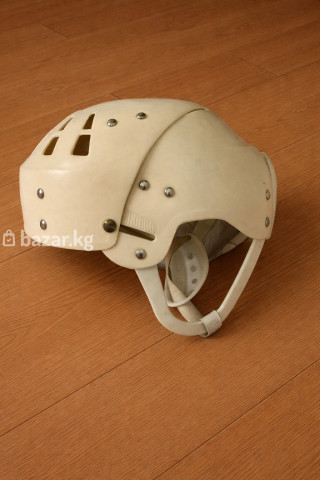 Хоккейный шлем ретро стиля (производство Латвия) из плотного и НЕХРУПКОГО пластика светлого цвета. - Конструкция из нескольких сегментов на заклёпках для лучшего охвата головы. - Удлинённая передняя часть с вентиляционными прорезями и дополнительной защитой лба/лица. - Жёсткие щёчные панели, фиксированные винтами. - Подбородочный ремень с регулируемой длиной и перфорированной накладкой под подбородок. - Внутренняя подвесная система с ремнями для посадки и амортизации. - Универсальный классический дизайн, подходящий для коллекции хоккейной экипировки, тематического декора или реконструкций. Цвет: слоновая кость/бежевый. Материал: формованный пластик, металлическая фурнитура, тканевые/кожзам ремни.