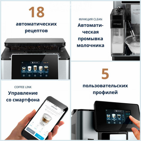 Основные характеристики Тип устройства кофемашина Тип автоматическая Количество групп 1 Тип используемого кофе молотый / зерновой Материал жерновов металл Мощность 1450 Вт Объем 2.2 л Давление помпы 19 бар Капучинатор есть Приготовление капучино автоматическое Тип напитка капучино, латте, латте макиато, лунго, ристретто, флэт уайт, эспрессо Дополнительные функции автоматическая декальцинация, автоотключение при неиспользовании, быстрый пар, одновременное приготовление двух чашек, подача горячей воды, подогрев чашек, предварительное смачивание Настройки жесткость воды, крепость кофе, объем порции горячей воды, температура кофе Тип управления сенсорное Управление со смартфона есть Уникальные технологии LatteCrema System Дополнительная информация материал корпуса - металл/пластик, объем емкости для молока 0.5 л; дисплей 4,3 ", цветной TFT, сенсорная панель, тип управления: сенсорный + мобильное приложение Coffee Link App, 3 профиля; система «зерновых профилей» Bean Adapt, звуковой сигнал, встроенные часы, таймер; кофемолка жерновая, металлическая, плоско-параллельная; регулировка диспенсера по высоте, регулировка количества молочной пены, 5 уровней крепости, 18 автоматических рецептов, функция "чай", автоматическая очистка капучинатора; комплектация: средство для удаления накипи, щетка для чистки, смягчающий фильтр, мерная ложка, индикаторная полоска, узел для удаления накипи Конструкция Тип нагревателя термоблок Материал корпуса металл Особенности конструкции дисплей, индикатор включения, контейнер для отходов, подсветка, подсветка дисплея, съемный лоток для сбора капель Кофемолка Встроенная кофемолка есть Емкость контейнера для зерен 500 г Регулировка степени помола есть Количество степеней помола 13 Габариты и вес Глубина 48.5 см Ширина 26.2 см Высота 39 см Вес 14.64 кг