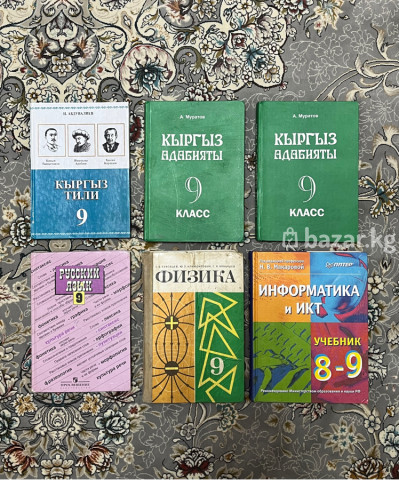 Комплект школьных учебников (9 класс и 8–9): - Кыргыз тили, 9 класс — 200 сом - Кыргыз адабияты, 9 класс (2 экземпляра) — по 200 сом каждый - Русский язык, 9 класс — 200 сом - Физика, 9 класс — 200 сом - Информатика и ИКТ, учебник 8–9 — 500 сом Все книги на фото; подписи с ценами указаны рядом с каждым изданием. Все вместе стоит 1500 сом