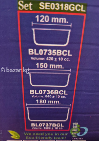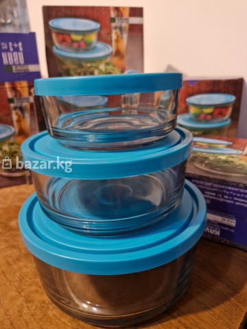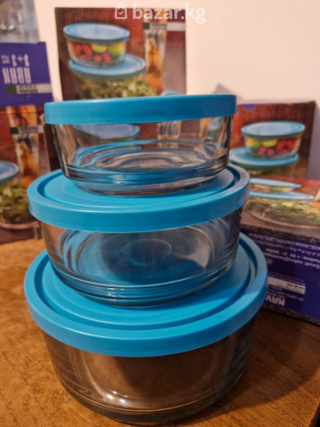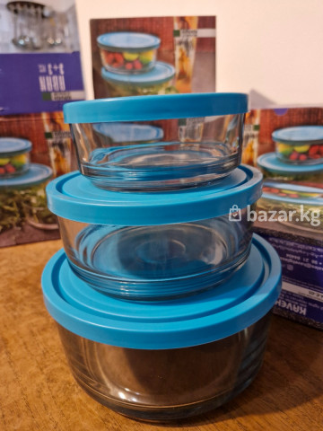Контейнеры стеклянные 3-в-1, круглые, с голубыми крышками. Комплектация и размеры: - 120 мм — объем 420 - 150 мм — объем 840 - 180 мм — объем 1500 Особенности: - Прозрачное закалённое стекло - Плотные крышки - Три размера для хранения порций, гарниров, салатов, ягод и т.д. - Подходят для холодильника и организации пространства на кухне, для разогрева пищи в микроволновке.
