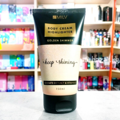 MILV Body Cream Highlighter (Golden Shimmer) Ваше тело в лучах золота Крем-хайлайтер «Keep Shining» — это секрет вашей уверенности и ослепительного образа. Он не только глубоко питает кожу благодаря экстракту граната и витамину E, но и придает ей роскошное золотистое сияние. Эффект: Визуально выравнивает тон кожи, скрывает мелкие несовершенства и создает эффект «атласного» тела, который особенно эффектно смотрится при мягком вечернем свете.
