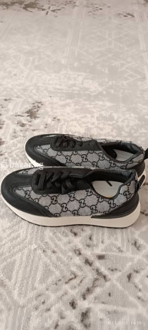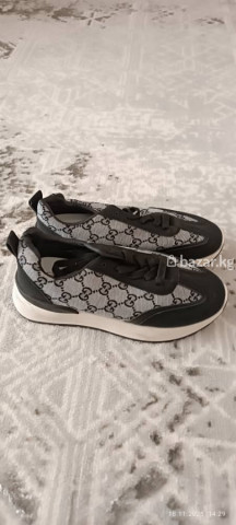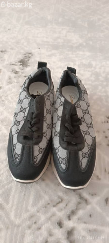Кроссовки с монограммным принтом GG - Лаконичный черно‑серый дизайн с контрастной белой подошвой - Верх: текстиль с повторяющимся узором GG, носок и берцы с накладками из черного материала под кожу - Классическая шнуровка, петли на пятке для удобного надевания - Подошва: легкая, амортизирующая, с небольшим перекатом - Внутренняя отделка: мягкий материал, стелька со светлым логотипом - Универсальный силуэт для повседневной носки и прогулок Подойдут к джинсам, джоггерам и кэжуал‑лукам в черно‑белой гамме.