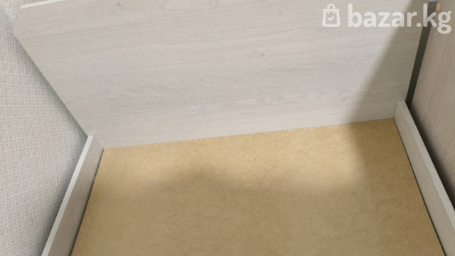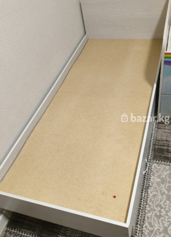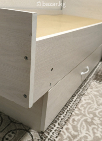 Односпальная кровать с матрасом и выдвижным ящиком. Практически новый очень бережно пользовались. Описание: - Размер спального места ориентировочно 80–90 × 190–200 см (узкая односпальная). - Каркас из ЛДСП светлого оттенка; изголовье и боковая стенка для удобства установки у стены. - Основание под матрас — сплошная плита. - Внизу — большой выдвижной ящик на роликовых направляющих, подходит для хранения постельного белья, одежды или учебных принадлежностей. Удобная ручка