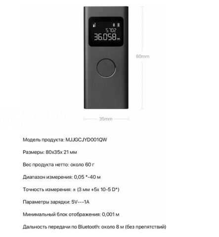 Модель: MJJGCJYD001QW Диапазон измерений: 0.05 - 40 м Точность измерения: +- (3мм+5*10-5D) Минимальная единица измерения отображения: 0.001м Единицы измерения: м/фут Тип лазера: длина волны 630-680 нм Литий-ионная аккумуляторная батарея: 3.7В 370мАч Жидкокристаллический дисплей: 1.23’’ Расстояние передачи BT: приблизительно 8м (без препятствий) Мощность BT: 8 дБм Диапазон частот: 2400-2483.5 МГц Вход для зарядки: 5В 1А Рабочая мощность: 0.7 Вт Время зарядки: приблизительно 100 мин Автоматическое выключение: 180с Размеры устройства: 80*35*21мм Вес нетто: около 60г #Дальномер #ЛазернаяРулетка40м #ЭлектроннаяРулетка #ПрофессиональныйДальномер #ЛазерныйИзмерительРасстояния #ДальномерДляСтроительства #РучнойДальномер #МиниДальномер #ПортативныйДальномер #ЦифровойДальномер #ДальномерДляЗамеров #ПриборДляИзмерений #ЛазерныйСканер #ИзмерительДистанции #ИнструментДляЗамеров #ЛазерныйИнструмент #ТочныйИзмеритель #Лазер40м #ИзмеренияРасстояний #ДальномерПортативный #СтройИнструмент #ЛазерныйПрибор #УмныйДальномер #ДальномерПрофессиональный #ТехникаДляСтроительства #ЛазерНа40м #ЛазернаяЛинейка40м #ИзмерительныйГаджет #СтроительныеИнструменты#ЛазерныйДальномер #XiaomiДальномер #XiaomiLaserMeasure #ЛазерныйДальномерXiaomi #Дальномер40м #XiaomiИнструмент #ИзмерительРасстояния #ЛазернаяРулетка #ИзмерительныйПрибор #ИнструментДляСтроительства #ТочныйДальномер #XiaomiTools #ЛазерныйИзмеритель #ДальномерДляСтроителей #ЛазерноеИзмерение #ДальномерДляРемонта #XiaomiSmartTool #КомпактныйДальномер #ЭлектронныйДальномер #ЛазернаяТехника #ДальномерДляДома #ИзмерительныеИнструменты #XiaomiDIY #СтроительныйИнструмент #ЛазернаяЛинейка #ДальномерВысокойТочности #XiaomiАксессуары #Измеритель40m #ЛазерныйИзмерительXiaomi #XiaomiЛазерныйДальномер