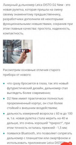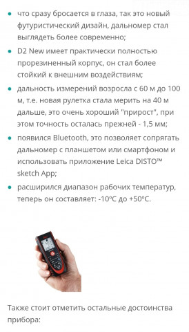 Лазерный дальномер Leica DISTO D2 New — это современная измерительная рулетка, разработанная на основе предыдущей модели с улучшенными функциями. Прибор отличается простотой использования, надежностью и компактностью. Он имеет современный футуристический дизайн и полностью прорезиненный корпус, что делает его более устойчивым к внешним воздействиям. Дальность измерений увеличена до 100 метров, при этом точность составляет 1,5 мм. Устройство оснащено Bluetooth для сопряжения со смартфоном или планшетом через приложение Leica DISTO™ sketch App. Расширенный диапазон рабочих температур от -10°C до +50°C позволяет использовать его в различных условиях. Компактные размеры (116 x 44 x 26 мм) и легкий корпус с боковыми рифлениями предотвращают выскальзывание. Многофункциональная скоба обеспечивает дополнительное удобство. Этот простой и надежный инструмент идеально подходит для проведения измерений как внутри помещений, так и на улице, даже при солнечной погоде. * Бренд: Leica * Модель: DISTO D2 New * Тип устройства: Лазерный дальномер * Дальность измерений: до 100 м * Точность измерений: 1,5 мм * Связь: Bluetooth * Совместимость: Приложение Leica DISTO™ sketch App * Диапазон рабочих температур: от -10°C до +50°C * Размеры: 116 x 44 x 26 мм * Корпус: Прорезиненный * Дизайн: Футуристический * Особенности корпуса: Боковые рифления * Дополнительная функция: Многофункциональная скоба * Применение: Внутренние и наружные измерения * Надежность: Высокая * Компактность: Да * Простота использования: Да * Цвет: Красный, черный * Материал чехла: Текстиль