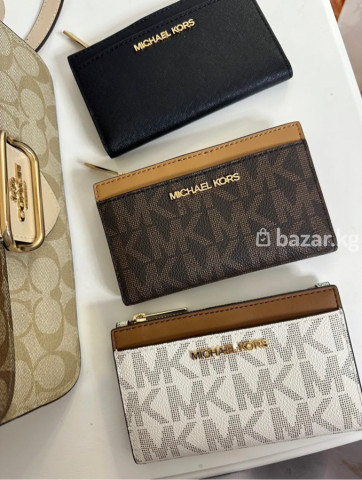 Компактные женские кошельки Michael Kors - Формат: мини-кошелёк/кардхолдер с монетницей на молнии - Материалы: фирменная кожа/канва Saffiano и логотипный принт MK; фурнитура под золото - Варианты: однотонный чёрный; коричневый с логотипом MK и бежевой отделкой; светлый (белый/бежевый) с логотипом MK и коричневой отделкой - Организация: - складывающийся блок на кнопке - 6+ слотов для карт - прозрачное окно для удостоверения/проездного - отделение для банкнот - внешняя монетница на молнии - Детали: тиснённый/металлический логотип MICHAEL KORS снаружи, фирменная подкладка, аккуратная прострочка - В комплекте: карточка по уходу (Care Card) на фото - Практичный размер — помещается в маленькие сумки и кросс-боди, удобен для ежедневного использования и путешествий, доступ к мелочи и картам одной рукой Элегантный аксессуар, сочетающий стиль и функциональность.