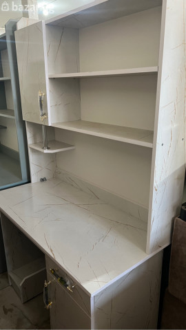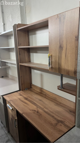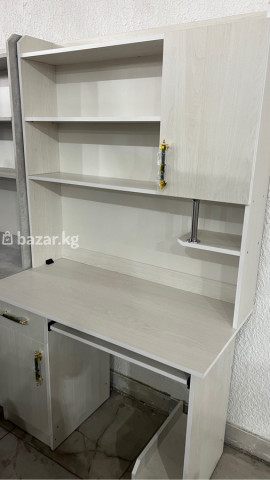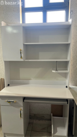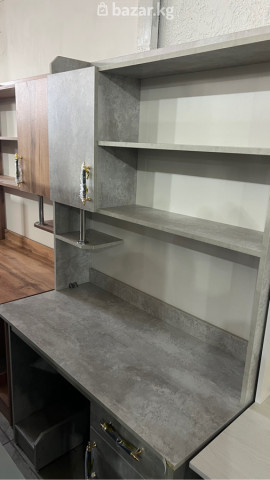- Конструкция: столешница с высокой надстройкой, две открытые полки во всю ширину, дополнительная угловая полочка на металлической опоре, закрытый шкафчик сверху, тумба снизу с дверцей и выдвижным ящиком, ниша под системный блок, выдвижная полка под клавиатуру. - Эргономика: большое рабочее поле, удобная организация хранения для книг, папок и аксессуаров, отдельные зоны для ПК. - Материалы: ЛДСП с кромкой, декоративные ручки, металлическая стойка-поддержка полки. - Варианты исполнения на фото: однотонный белый, серый, графит/бетон, а также декор под мрамор/камень. - Подходит для дома, кабинета, детской или учебного места.