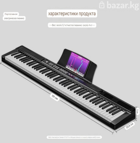 Пианино полноразмерный 88клавиш Размер клавиши 22мм Тип полузвешанные Чувствительные к нажатию Возможно подключение к применению для обучения Вес примерно 5кг Состояние новое В комплекте Педаль, Адаптер питания