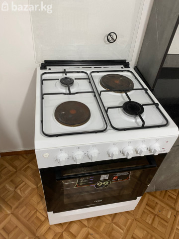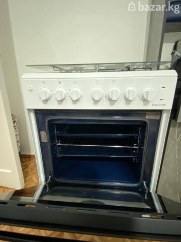 Газовая плита Artel Dolce 21-EX с электрической духовкой и стеклянной крышкой. Основные характеристики: - 4 конфорки: 3 газовые + 1 электроконфорка (с чугунными решетками). - Электроподжиг панели. - Духовка электрическая, фронтальная дверь из тёмного термостойкого стекла. - Покрытие духовки Bio Ceramic (антибактериальный эффект до 99% согласно маркировке). - Механическое управление: 6 поворотных регуляторов — по одной ручке на каждую конфорку и отдельные регуляторы для духовки/режимов. - Индикатор работы на панели. - Защитная стеклянная крышка варочной поверхности. - Нижний выдвижной ящик/отсек для посуды. - Цвет: белый, фасад духовки чёрный. - Бренд: artel, модель Dolce 21-EX (указано на панели).