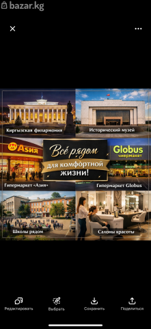 Квартира расположена в самом центре города, в шаговой доступности от Бишкек Парк и Кыргызская национальная филармония имени Токтогула Сатылганова. Рядом находятся Кыргызский национальный университет имени Жусупа Баласагына и другие учебные заведения, включая колледжи. Вблизи есть всё необходимое для комфортной жизни: детские сады, школы, стадион, магазины, аптеки, тренажёрные залы и салоны красоты, а также крупные гипермаркеты. Отличная транспортная доступность: рядом остановки общественного транспорта и удобная транспортная развязка, что позволяет быстро добраться в любую часть города. Дом с хорошей шумо- и теплоизоляцией: стены толстые, зимой в квартире тепло, а летом сохраняется приятная прохлада.
