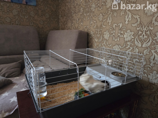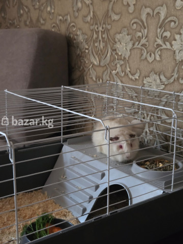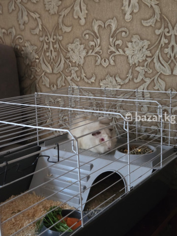 Клетка для грызунов с двухуровневой площадкой и домиком -Морская свинка мальчик 8 месяцев белый цвет. Клетка: -Просторная пластиковая база с высокими бортами, металлическая решётка сверху - Встроенный пластиковый домик с арочным входом и наклонным пандусом - Верхняя площадка с защитным бортиком — удобно для мисок и отдыха - Дверца/крышка на петлях для доступа и уборки - Наполнитель: опилки (пример размещения на фото) - В комплекте показаны две миски: для зерносмеси и для свежих овощей/зелени - Нейтральный цвет: тёмное дно, светло‑серая надстройка, белая решётка Размер визуально позволяет разместить зону кормления, домик и прогулочную часть; отлично организует пространство питомца на двух уровнях.