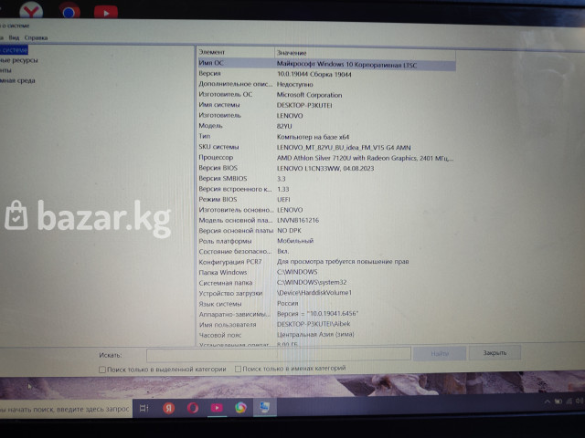 Lenovo IdeaPad 15 (серия V15 G4, модель 82YU) — универсальный 15,6" ноутбук на базе AMD. Характеристики по данным системы: - Процессор: AMD Athlon Silver 7120U (2 ядра, интегрированная графика Radeon). - Экран: 15,6", тонкие рамки. - Клавиатура: полноразмерная, раскладка RU/ENG. - ОС: Windows 10 Корпоративная LTSC, версия 19044. - BIOS: L1CN33WW (от 04.08.2023), режим UEFI. - Платформа: мобильная, производитель платы Lenovo. - Наличие веб‑камеры с шторкой. - Беспроводные модули: Wi‑Fi, Bluetooth (иконки в трее). - Порты и ввод: тачпад с поддержкой жестов, стандартный набор разъемов по бокам (питание слева на фото). Подходит для учебы, офиса, веб‑серфинга, мультимедийных задач. В комплекте — фирменная коробка Lenovo.