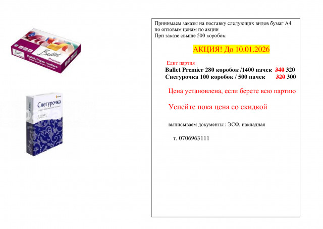 Принимаем заказы на поставку следующих видов офисных бумаг А4 по оптовым ценам по предоплате