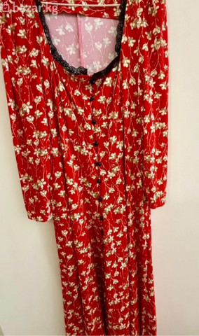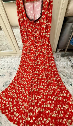 Красное длинное платье с цветочным принтом - Бренд: Malclub KG (ярлык на изделии) - Длина: макси - Рукава: длинные - Застежка: ряд пуговиц спереди по всей длине - Вырез: округлый, оформлен узкой черной кружевной отделкой - Посадка: приталенный лиф, расклешенная юбка - Ткань: мягкая, легкая, с подкладочной деталью по лифу (видна на фото) - Принт: мелкие кремово-бежевые цветы на ярко-красном фоне - Детали: аккуратная оверлочная обработка швов, мелкие сборки по лифу для посадки Отлично подходит для повседневных образов и мероприятий: романтичный силуэт, выразительный цвет и комфортная ткань.
