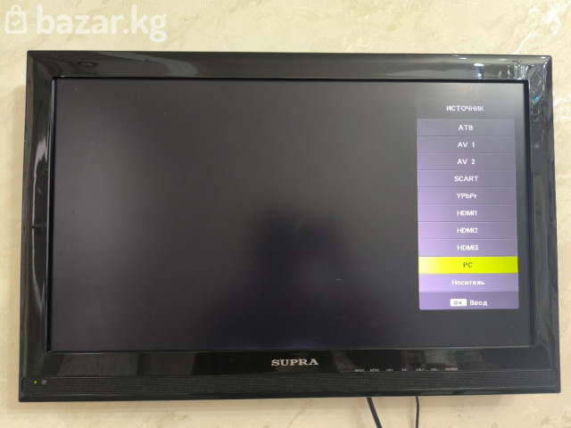 Телевизор SUPRA, диагональ около 32" (визуально). Плоская панель, настенное крепление. Управление кнопками на корпусе: Input, Menu, CH+/CH−, VOL+/VOL−, Power. Встроенная акустика по нижней кромке. Поддерживаемые источники (меню «Источник» на экране): - ATV (эфирное ТВ) - AV1, AV2 - SCART - YPbPr (компонент) - HDMI1, HDMI2, HDMI3 - PC (VGA) - Носитель (USB) Размеры сбоку корпуса: AV/компонент, аудио и др. Подходит для подключения приставок, ПК, медиаплееров и игровых консолей через HDMI, а также старой техники через SCART/AV/компонент. Возможен просмотр с USB-накопителя (фото/видео, в зависимости от поддерживаемых форматов модели). но не имеется пульт.