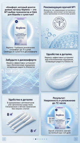 Профессиональное средство №1 по рекомендации врачей для устранения интимной сухости и дискомфорта. Replens восполняет естественную влагу и обеспечивает длительный эффект. Основные преимущества: Эффект до 3 дней: Формула длительного действия, не требующая ежедневного применения. Без гормонов: Не содержит эстроген, парабены и ароматизаторы. Устранение дискомфорта: Помогает снять зуд и болезненность при интимной близости. Удобство использования: В упаковке 8 гигиеничных одноразовых аппликаторов, готовых к применению. Характеристики: Объем: 8 предварительно заполненных аппликаторов. Срок действия курса: 24 дня. Совместимость: Можно использовать с латексными изделиями. 🇺🇸 🚩 Оригинал США. 📩 ДЛЯ ЗАКАЗА И КОНСУЛЬТАЦИИ: WhatsApp: +1 (754) 971-3802 #Бишкек #Кыргызстан #БазарКГ #ЖенскоеЗдоровье #Replens #Здоровье #УходБишкек #ОригиналСША #Саламаттык #АйымдарҮчүн #БишкекКосметика