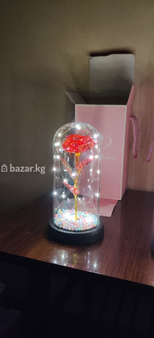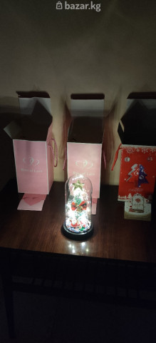 Декоративный светильник-ночник “Роза под колбой” - Композиция: искусственная роза с золотистым стеблем и лепестками хамелеон в стеклянном куполе. - Подсветка: тонкая светодиодная гирлянда теплого белого света, равномерно распределена вокруг цветка. - Основание: черное, устойчивая платформа. - Наполнение: декоративные пастельные шарики у основания. - Размеры колбы: высота около 22 см, диаметр основания около 11 см (как на схеме с елочкой). - Питание: от батареек для гирлянды (управление одним переключателем). - Назначение: ночник и интерьерный декор для спальни, гостиной, рабочего стола; эффектный подарок и романтический акцент. Особенности: - Прозрачная стеклянная колба защищает композицию от пыли и усиливает свечение. - Мягкое сияние создает уют, не слепит и подходит для вечернего освещения. - Легкая, портативная конструкция — можно переставлять в любой уголок дома