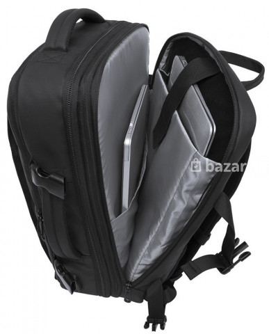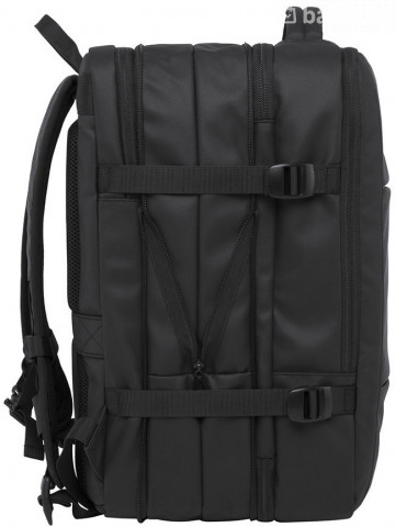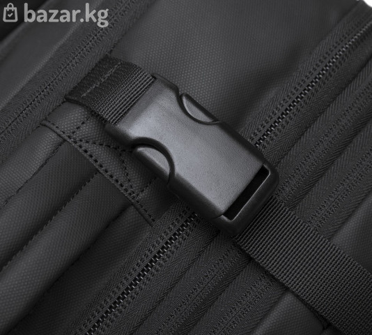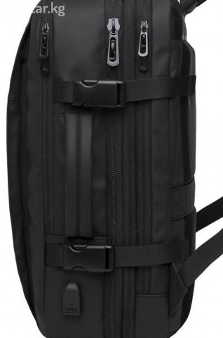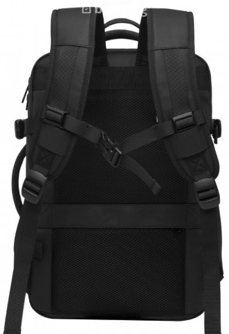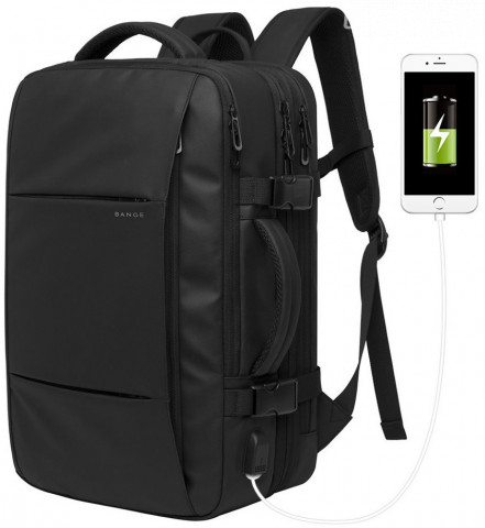 Рюкзак BANGE BG1908 обладает невероятной вместительностью для переноски всех необходимых вещей. В нем предусмотрено 4 объемных отсека, которые закрываются двойными молниями. Для надежности они фиксируются несколькими крепежными лентами на карабинах. При необходимости рюкзак может быть увеличен в объеме с помощью вертикальной молнии, которую следует расстегнуть. По своей функциональности этот рюкзак напоминает малогабаритный чемодан. Так, одни из его отсеков полностью открывается, как крышка чемодана, обеспечивая свободный доступ к вещам. Для удобства они накрываются сетчатой перегородкой на молниях. С другой стороны располагается небольшой сетчатый карман для быстрого доступа к содержимому. В отсеке ближе к спинке находится усиленная часть с карманами для ноутбука на 15,6 дюймов и планшета. Пара карманов для мелочей располагается на передней панели рюкзака. Их молнии скрыты под тканевым слоем. BG1908 имеет сетчатую вентилируемую спинку, мягкие лямки, регулируемые по длине, целых три ручки для переноски изделия в руках: две мягкие, а третья — тканевая. Одна из этих ручек позволяет носить рюкзак как дорожную сумку. На спинке находится потайной карман для ценных вещей и багажный ремень для закрепления на ручке дорожной сумки. Для равномерного распределения нагрузки лямки соединяются лентой с карабином. На одной из сторон расположился внешний USB-выход.