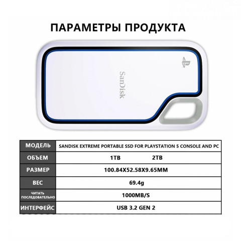 Проложите себе путь к победе с этим официально лицензированным портативным SSD для PlayStation®. Ощутите азарт игры с официально лицензированным портативным SSD SanDisk Extreme™ для консолей PlayStation®5 и ПК. С месячной пробной версией Nitro5 вы получите все преимущества Nitro, включая потоковую передачу HD-видео, два ускорения серверов и многое другое. Кроме того, получите до 2 ТБ² хранилища для архивации ваших последних действий, доступа к новым возможностям и максимального использования Discord. Благодаря невероятной скорости чтения до 1000 МБ/с¹ вы сможете быстро распаковывать игры и окунаться в новое приключение. Кроме того, благодаря классу защиты от воды и пыли IP65 и устойчивости к падениям с высоты до 3 метров² вы можете безопасно брать любимые игры с собой. Лицензия PlayStation® Разработанный, протестированный и сертифицированный специально для консолей PlayStation®, этот накопитель позволяет геймерам быстро и легко окунуться в мир игр PlayStation®. Гонка со временем! Благодаря повышенной скорости до 1000 МБ/с¹ вы можете быстро переносить сохранения игр с внешнего SSD во внутреннюю память PlayStation®5. Расширьте свою библиотеку игр PlayStation®5! Увеличьте хранилище для новейших и лучших игр PlayStation®5, позволяя хранить больше игр, не удаляя старые. Игры PlayStation® для ПК предназначены только для игр PlayStation®; храните свою библиотеку на этом высокоскоростном SSD и играйте в них без проблем с диска, подключенного к вашему ПК. Discord Nitro5: Пробная версия Nitro на месяц предоставит вам все преимущества Nitro, включая потоковую передачу HD-контента, два ускорения серверов и многое другое, чтобы вы могли получить больше удовольствия и использовать Discord по максимуму. Играйте с легкостью благодаря защите IP65 и защите от падений с высоты до 3 метров. Ваши приключения на PlayStation® подкреплены качеством и надежностью, разработанными SanDisk Основные характеристики Бренд SanDisk Емкость 1 ТБ Форм-фактор 2.5″ Вид портативный Подключение к компьютеру Интерфейс USB USB 3.2 Gen 2 Type-C Параметры диска Скорость чтения 950 МБ/с Скорость записи 1000 МБ/с Шум и ударостойкость Защищенность от влаги, от пыли Дополнительно Материал корпуса пластик Макс. рабочая температура 35 °C Высота 9.6 мм Длина 100.8 мм Ширина 52.55 мм Вес 69.4 г Комплектация Портативный твердотельный накопитель SanDisk Extreme™ для PlayStation 5 и ПК Дополнительная информация Разработанный, протестированный и сертифицированный специально для консоли PlayStation®5, он позволяет игрокам быстро и без проблем погрузиться в мир игр PlayStation®. Благодаря повышенной скорости до 1000 МБ/с вы можете быстро перенести сохранения игр с внешнего SSD-накопителя во внутреннюю память PlayStation®5. Совместимость консоли PS5®, Windows® 10+, macOS 13 и выше Многие устройства USB Type-C™ например, смартфоны, ноутбуки, планшеты