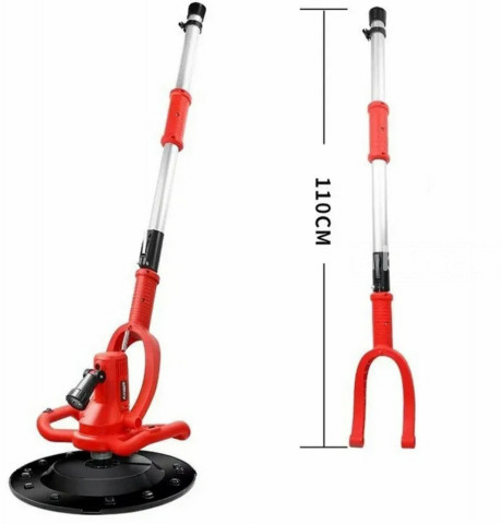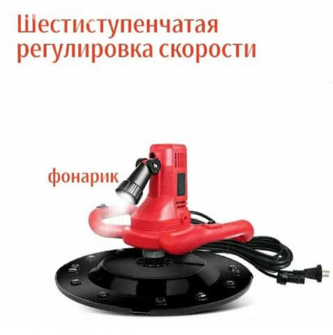 - Назначение: шлифовка и затирка поверхностей после стяжки и шпаклевания; подходит для пола, стен и потолков. - Конструкция: круглая шлифовальная платформа с защитным кожухом; удобная передняя рукоять; телескопическая штанга для работы на высоте. - Освещение рабочей зоны: встроенный направляемый фонарик. - Регулировка оборотов: шестиступенчатая, переключатель на корпусе для точной подстройки скорости под материал и зернистость. - Совместимость с оснасткой: круги/площадки разной зернистости и типов - Питание: от сети, кабель в комплекте. Преимущества: - Равномерная обработка больших площадей. - Удобство при работе на потолках и высоких стенах благодаря «жираф»-штанге. - Контроль качества за счет локальной подсветки и точной регулировки скорости.