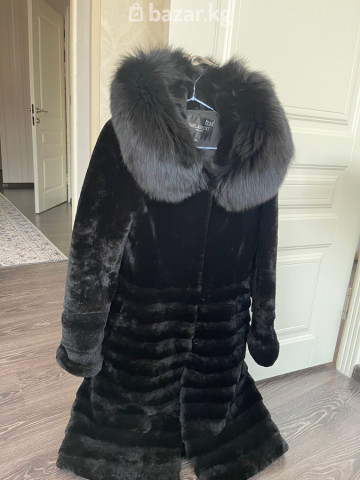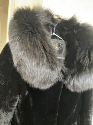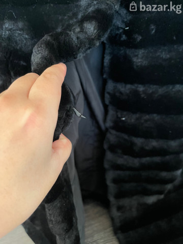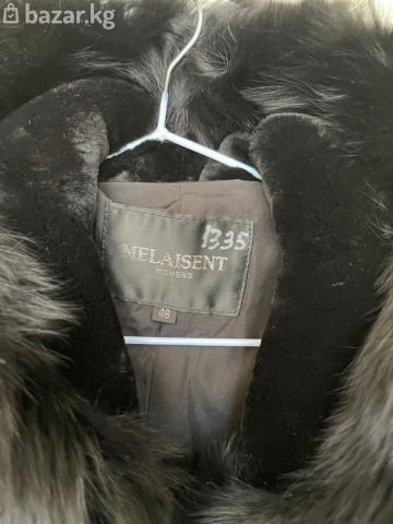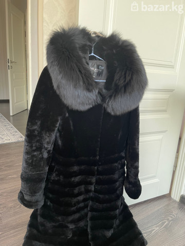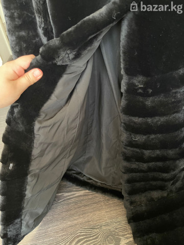 Шуба из натурального меха, черного цвета, длина ниже колена. Модель с объемным густым воротником из серо-черного меха (пушистый стоячий/апаш), который красиво обрамляет шею и плечи. Верхняя часть гладко стриженная, нижняя — с поперечной раскладкой меха (полосы), что визуально вытягивает силуэт. Рукава прямые с мягкими манжетами. Застежка скрытая по центральной планке. Внутри подкладка темно-серого цвета. На вешалке виден ярлык бренда B35 MELANSET. Подойдет для зимних температур, торжественных выходов и повседневной носки. Классический фасон, благородный цвет и фактурный воротник делают образ элегантным и эффектным. Размер на ярлыке не указан на фото; ориентируйтесь по посадке — силуэт полуприталенный.