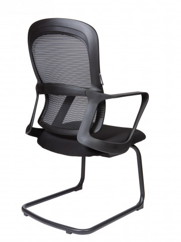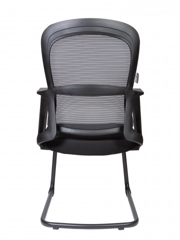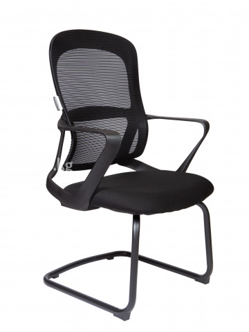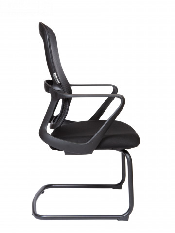 Спинка без подголовника, сетка армированная. Сидение ткань. Полозья металл. Максимальная нагрузка до 110 кг. - Эргономичная спинка из дышащей сетки: поддерживает спину, обеспечивает вентиляцию в течение рабочего дня. - Удобное фиксированное сиденье с мягким поролоновым наполнением. - Подлокотники из прочного пластика для естественной опоры рук. - Надежная металлокаркасная база на полозьях: устойчивость, плавное покачивание при посадке, аккуратные пластиковые накладки на опорах для защиты пола. - Лаконичный современный дизайн в черном цвете — подходит для приемных, переговорных, зон ожидания и рабочих мест. - Компактные габариты, продуманная форма спинки с выраженной поясничной поддержкой.
