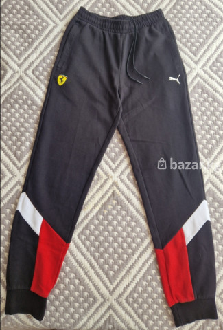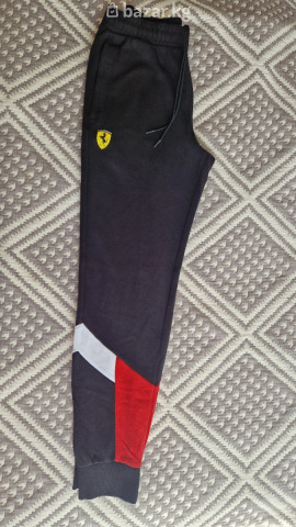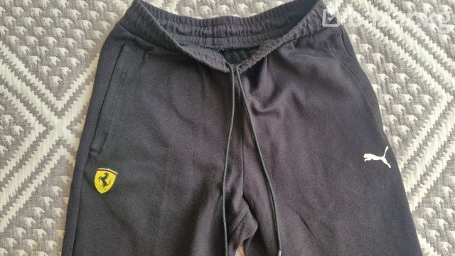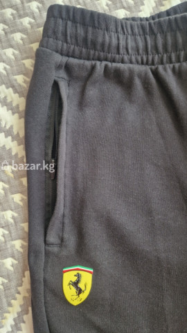 Спортивные брюки Puma x Scuderia Ferrari - Цвет: черный с контрастными вставками красного и белого на штанинах - Брендинг: логотип Puma на правой стороне, шеврон Scuderia Ferrari на левой - Посадка: зауженные книзу, манжеты-резинки - Пояс: эластичный с регулируемым шнурком - Карманы: два боковых спереди, один прорезной сзади - Материал: мягкий трикотаж (хлопковая основа с добавлением синтетики для износостойкости)