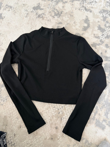 Черный укороченный спортивный топ (рашгард) с длинными рукавами. Бирка не сохранилась, примеряли пару раз, но не носили. - Фасон: облегающий кроп-топ, до пупка - Размер: S, но он тянется может подойти на М - Материал: полиэстер, тонкий, очень быстро сохнет, поэтому идеально подходит для спорта 🌷Забрать можно в районе АУЦА