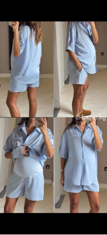 Женский комплект в стиле casual: свободная рубашка + шорты, цвет нежно‑голубой. Особенности: - Оверсайз рубашка на пуговицах, отложной воротник, накладной карман‑обманка, рукав до локтя с подворотом. - Шорты средней длины с удобной посадкой на резинке, боковые карманы, небольшие разрезы по бокам. - Мягкая легкая ткань с гладкой фактурой, приятная к телу и дышащая. - Универсальный крой — комфортно для повседневной носки, дома, отдыха и поездок; подходит для разного типа фигур. - Гармонично смотрится как комплект или по отдельности: рубашку можно заправлять, носить навыпуск или нараспашку. Цвет: светло‑голубой. Состав ткани: гладкая вискозная/полиэфирная смесь (по виду — струящаяся, шелковистая).