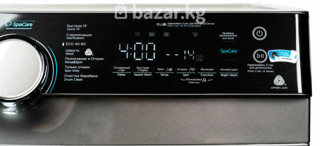 Характеристики Загрузка 12 кг Цвет Серый Управление Сенсорное Дисплей Сенсорный Количество программ 14 Скорость отжима 1400 оборотов Быстрая стирка 15 минут Программа "Мой цикл" Есть Функция Speed Wash сокращение времени цикла стирки SpaCare 99.99% sterilization Есть Выбор уровня загрязнений Да Ночной цикл Есть Функция пара Да Ребра Активаторы S-образной формы Барабан Water Magic Cube Мотор QUATTRO INVERTER (BLDC) Максимальная температура 90 °C Габариты в мм(ШxГxВ) 595x595x850 Класс энергопотребления А+++