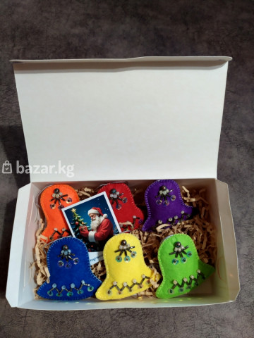 Продается набор сувенирных колокольчиков. В наборе 6 штук. Колокольчики сшиты из фетра(тонкий войлок) и расшиты бисером, бусинами и пайетками. Колокольчики двусторонние. Размер одного колокольчика - 7 см. в высоту. Набор упакован в коробку. Колокольчики можно использовать для украшения дома, повесить на ёлку, преподнести кому-нибудь в качестве подарка.