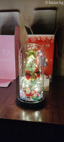Новогодний декоративный светильник - Композиция в стеклянной колбе с черным основанием: мини-елка с золотой звездой на макушке, праздничным бантом и фигуркой Санты у подножия. - Внутри — теплые светодиодные огоньки на тонкой гирлянде, создающие мягкое сияние. - Декор основания: разноцветные шарики, мини-грибочки и травка. - Размеры указаны на фото: высота 22 см (8.66"), диаметр основания 11 см (4.33"). - Питание: светодиодная гирлянда (тип батареек/питания не указан на фото). - Идеально для новогоднего декора дома, офиса, каминной полки или в качестве интерьерного ночника/подарка. - Поставляется в подарочной коробке (вид на фото).