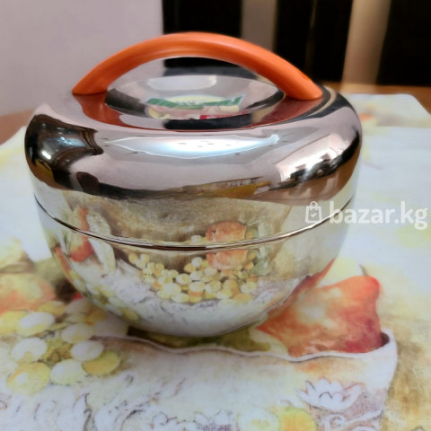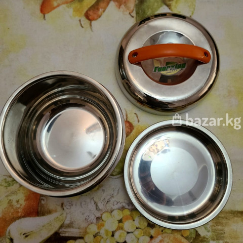 Термос-супница/контейнер для еды из нержавеющей стали Fuertino. - Материал: нержавеющая сталь, зеркальная полировка. - Конструкция из трех частей: внешняя чаша-термос, внутренняя миска-вкладыш и крышка. - Крышка с удобной оранжевой ручкой для переноски. - Подходит для хранения и подачи супов, каш, гарниров и салатов, поддерживает температуру блюд дольше обычной посуды. - Гигиеничная гладкая поверхность, легко моется. - Компактная круглая форма, устойчивое широкое дно. Практичный контейнер для дома, офиса, пикников и поездок.