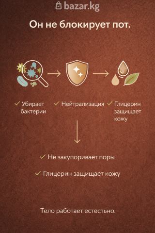 Натуральный дезодорант-спрей без спирта, парабенов и алюминия. Не блокирует потовые железы — нейтрализует причину запаха. Работает мягко, без раздражений. ✅ Без алюминия ✅ Без спирта ✅ Без парабенов ✅ Подходит для чувствительной кожи ✅ Унисекс ✅ Компактный формат 20мл — удобно носить с собой Состав: дистиллированная вода, алюмокалиевые квасцы, глицерин, консервант, эфирные масла (петитгрейн, кориандр, сибирская пихта). Производство: Бишкек, Кыргызстан Бренд: RaiF Element https://raif.love/ 📦 Доставка по Бишкеку и КР 💳 Оплата: наличные / перевод