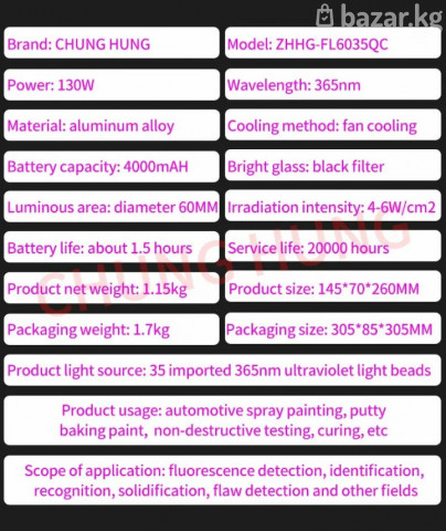 Модель: ZHHG-FL6035QC Мощность: 130 Вт Светящаяся область: диаметр: 60 мм Длина волны: 365 нм Емкость аккумулятора: 4000 мАч Интенсивность излучения: 4-6 Вт/см² Светящаяся поверхность стекла: черный фильтр Метод охлаждения: охлаждение вентилятором Материал: алюминиевый сплав Срок службы: 20000 часов Производство и сборка системы УФ-светодиодных ламп для отверждения: Исследование и разработка системы отверждения с использованием УФ-светодиодных ламп: Применение и классификация УФ-светодиодных ламп для отверждения: Особенности продукта: УФ-светодиодная лампа для отверждения Применение уникальной оптической технологии для максимального обеспечения оптической равномерности, выходной мощности и оптической энергии; Мы можем предоставить чистые ультрафиолетовые светодиодные чипы холодного света с длиной волны от 365 нм до 405 нм. Применение передовой технологии упаковки для быстрого охлаждения нагревательных компонентов; Интерфейс 1/0, интерфейс RS-232C для связи с ПЛК, чтобы удовлетворить различные потребности в сфере промышленной автоматизации. Этот продукт оснащен системой мониторинга с сигнализацией утечки/короткого замыкания/разрыва цепи, а также сигнализацией о высокой температуре внутри излучающей головки. Цифровой дисплей отображает температуру радиатора и коды неисправностей. Номер модели: FL6035QC Тип товара: Ультрафиолетовые лампы Источник питания: DC Сертификация: Обязательный сертификат КНР, Европейский сертификат соответствия, ROHS Входят ли лампочки в комплект: Да Единица измерения: штука/штуки Количество: 1 Световой Поток: <60 Мощность: A battery #уффонарик #ультрафиолетовыйфонарик #фонарикдляпроверки #проверкашпаклевки #проверкаавто #проверкакрасок #проверкапокраски #проверкакутузова #автопроверка #поискдефектов #проверкаремонта #обнаружениедефектов #проверкаскрытыхповреждений #уфсвет #365нм #ультрафиолет #уфдетектор #уфдетекция #люминесценция #спецсвет #дляавто #автоаксессуары #товарыдляавто #диагностикаавто #проверкакузова #покупкаавто #подборавто #осмотравто #автоэксперт #автоподбор #карманныйфонарик #портативныйфонарик #компактныйфонарь #яркийфонарик #светодиодныйфонарь #профессиональныйинструмент #полезныйгаджет #оборудованиедляавто