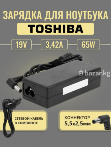 Зарядное устройство для ноутбуков Toshiba. Технические характеристики: - Выходное напряжение: 19V - Ток: 3,42A - Мощность: 65W - Коннектор: 5,5 × 2,5 мм (угловой штекер) Комплектация: - Блок питания - Сетевой кабель Подходит для моделей ноутбуков Toshiba с разъемом 5,5×2,5 мм и параметрами 19V/3.42A/65W. Компактный адаптер с трехконтактным входом питания, удобный для дома и офиса.